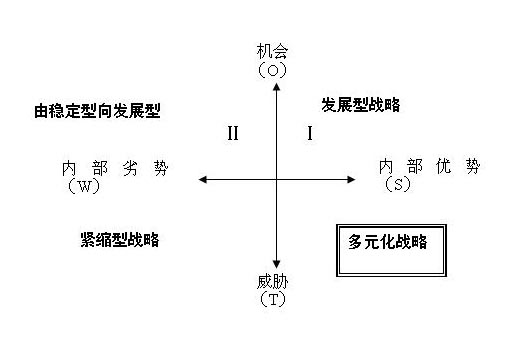 一般说来,当企业处于第Ⅰ象限,应该发挥优势,利用机会,采用发展型战略,即SO战略;当企业处于第Ⅱ象限,应该利用机会,克服弱点,采用由稳定型向发展型战略,即WO战略;当企业处于第Ⅲ象限,应该减少弱点,回避威胁,采用紧缩型战略,即WT战略;当企业处于第Ⅳ象限,应该利用优势,回避威胁,采用多元化战略,即ST战略。