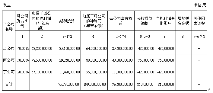 2、表三计算时,“期初投资“指标要按照旧比例计算。因比例不同造成的损益、权益的差额记在“其他调整因素”指标下,母公司确认时在所有者权益变动表上“其他综合收益”行次反映。