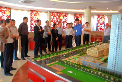 李新民书记一行首先来到“九洲方圆创意园”项目售楼处了解了项目整体概况、规划,仔细询问了项目销售情况。随后,来到项目施工现场,查看了项目施工质量,并与项目管理人员进行了座谈,听取了金河公司整体工作情况和天津“九洲方圆创意园”项目工作进展情况汇报。