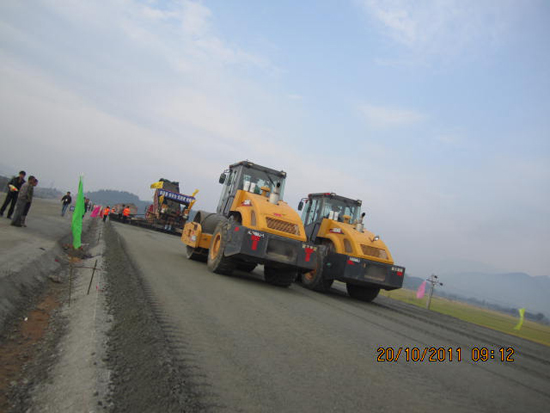 施工中严格按照施工图纸泼洒水泥浆联接层,测量人员跟机作业,派专人复测摊铺后的松铺厚度与标高,发现异常及时查明原因,及时采用人工进行处理。初压、复压、终压严格按施工方案进行,碾压成型后,采用土工布并用水车洒水养生。