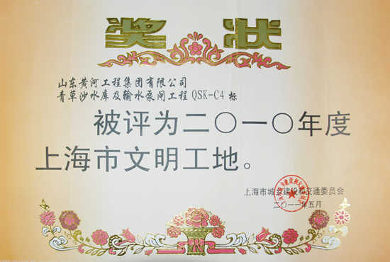 日前,山东黄河工程集团承建的上海市青草沙水库及输水泵闸工程QSK-C4标被上海市城乡建设和交通委员会评为2010年度上海市文明工地称号。