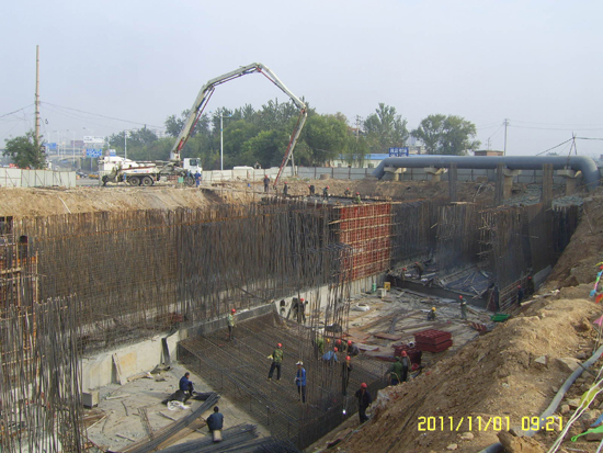 本涵洞工程与腊山分洪道设计轴线斜交60度,由两联4孔4.5X5.5m涵洞组成,总长64m,宽度25米。混凝土用量约6200方,钢筋制安约720吨,项目部克服工期紧,任务重,施工场地狭小及深基坑、高地下水位等困难,充分发挥黄河铁军精神,加班加点,历时70余天,按要求完成涵洞主体施工。