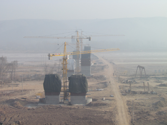 内蒙柳林滩黄河特大桥是准格尔至兴和重载高速公路的控制性工程,主要结构特点是高墩、大跨、大体积混凝土及大型T梁。大桥全长1.88千米,主桥最大跨径140米,单个悬浇节段最大重量246千克,全桥最高墩身为83.8米,桩基直径为2米,最大桩长78米。该项目科技含量高、施工工序繁琐、工期紧,再加上山东黄河工程集团公司职工冬季在严寒地区施工还是第一次,难度之大可想而知。面对巨大的工期压力和种种挑战,集团公司参战人员充分发扬“黄河铁军”精神,顶风冒雪,顽强拼搏,工程建设得到快速推进。