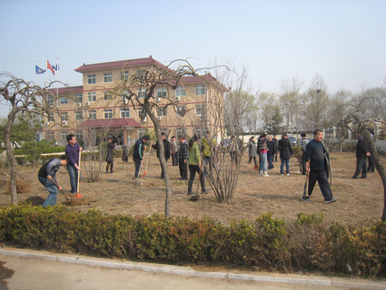 在现场,大家干的热火朝天,有的挥锄挖坑,有的挑水浇树,整个院里呈现一派火热的劳动场景,在职工的齐心协力下,经过接近一个小时的时间,满园树苗迎风挺立,展示着它的生机勃发。