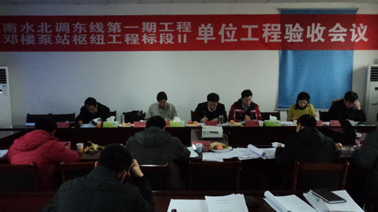 1月31日,由山东省南水北调南四湖至东平湖段工程建设管理局、工程质量监督项目站,山东省水利勘测设计院、山东省科源工程建设监理中心、山东黄河工程集团有限公司、山东省水工机械厂六家单位组成的邓楼泵站单位工程验收工作组,对邓楼泵站枢纽工程引水闸、出水涵闸及节制闸三个单位工程进行了单位工程验收。