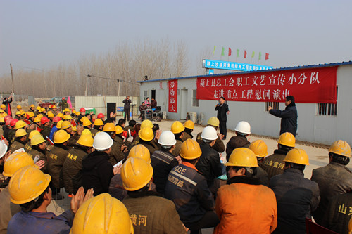 置隆冬腊八之际,颍上县总工会主席率县总工会文艺宣传小分队到山东黄河工程集团有限公司承建的颍上复线船闸工地现场慰问演出,复线船闸建设者200余工人兴致勃勃的观看了演出。