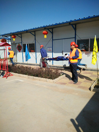 上午8点,演习开始,职工发现火情,迅速拉响警报装置,并第一时间报告工地应急救援总指挥,总指挥立即启动项目部应急预案,通知疏散救援组和灭火组进行人员逃生、救助、疏散,控制火情。 发现有人员受伤,立即拨打120急救电话,救护车赶到,把伤员现场抢救,随后送往医院救治。在初步灭火处理的同时,火势继续蔓延,很难控制,立即拨打119指挥中心,鹿泉区消防大队马上出警,救援灭火,随后大火扑灭。总指挥宣布结束应急状态,解除警报,演习结束。
