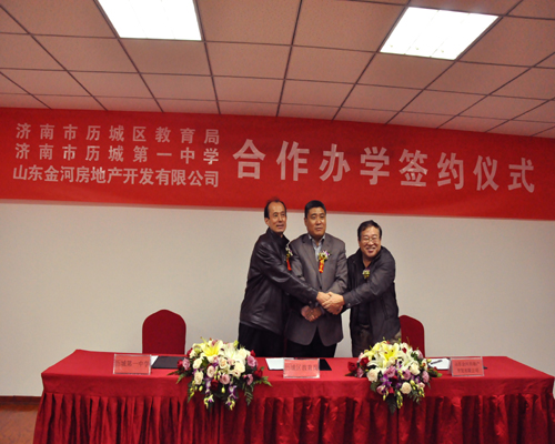 上午10点58分,三方代表——历城区教育局副局长陈学柱、历城一中校长金巍、集团公司副总经理赵永华在金河公司会议室签署三方协议,济南市历城第一中学正式入主河泰·优山美郡初中,为小区的孩子们带来优质的教学和管理。