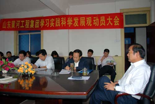 集团公司董事长、党委书记郭学鑫同志在动员讲话中指出,科学发展观是党的三代中央领导集体关于发展的重要思想的继承和发展,是马克思主义关于发展的世界观和方法论的集中体现,学习实践科学发展观活动,是当前集团公司的一项重要工作,各单位、各部门务必要提高认识,通过多种载体、多种形式,充分发挥集团公司网站和《黄河铁军报》的舆论宣传优势,组织好学习发动和宣传教育。他强调指出,山东黄河工程集团学习实践科学发展观活动主题是“科学发展、富民强省”,实践载体是“解放思想,改革创新,努力提升员工满意度,实现集团公司的健康、和谐、稳健发展”。确定这样的活动主题、实践载体符合科学发展观的要求,符合集团公司规模扩张的阶段性要求,充分体现了集团公司发展战略的持续性和一贯性。