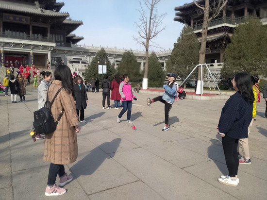 绕湖行进一圈后,女职工们在大明湖超然楼前又开始了趣味踢毽子活动。