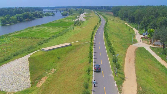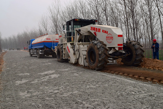 技术革新提高了工作效率,降低了劳动强度。经过认真考察论证,采取了冷再生技术,使用冷再生机将原路面粉碎,掺加一定比例的碎石、水泥、石灰作为底基层,不破坏原道路下部结构,也不受天气影响,节约了资源,简化了施工工序。该项目被山东黄河河河务局确定为冷再生技术推广的典型案例。在施工中,还配备了拖斗式码灰机械装置、GPS卫星定位系统等专业施工机械。拖斗式码灰机械装置可减少人力,并且灰带密实,比传统码方提高综合工效达3倍,该装置获得黄委"三新"技术认定。