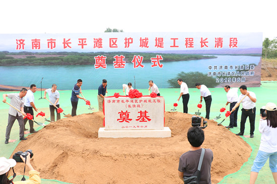 6月20日上午10时,济南市长平滩区护城堤工程长清段建设工程奠基仪式隆重举行。省黄河滩区迁建推进组副处长刘华蓓、市城乡水务局副局长巩振茂、长清区副区长刘永亭、山东黄河工程集团党委委员张延乐、长清区各级单位以及各参建单位、服务单位参加。