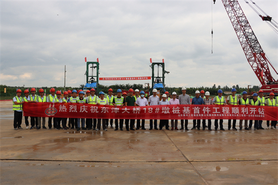 东津黄河大桥是工程集团与中铁十四局等单位共同投资建设的BOT项目,概算投资14.67亿元,计划工期36个月。自项目进场以来,经过全体人员共同努力,项目部已组建,拌合站、试验室、生产生活区等已建设完成,机械、人员、材料已到位,达到了施工生产条件。18#主墩群桩基础首件工程(26#桩)于当日正式开钻,大桥主墩下部结构施工全面展开。