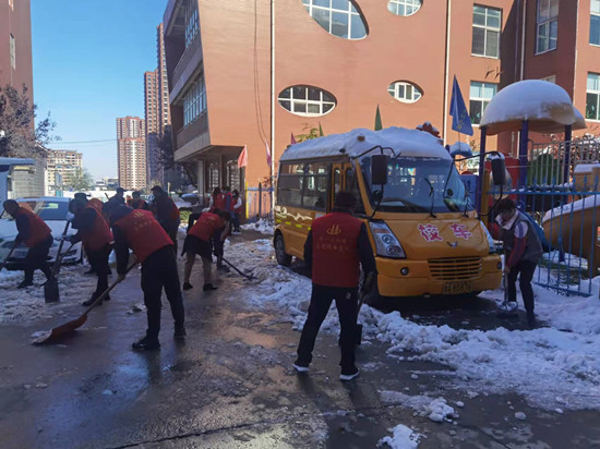 活动中志愿者们不畏严寒,手持铲雪工具,铲的铲、扫的扫,全力铲除积雪和结冰,为社区居民铲出了一条条暖心道路。