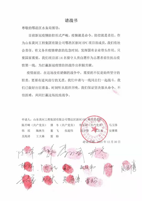 抗疫我在前,一线显担当。2021年12月30日,第二工程处留守在西安鄠邑区的党员职工联名向区水务局主动请战,上交《请战书》,自愿作为志愿者前往抗击疫情的第一线,发挥工程集团党员干部先锋模范作用,与人民群众同心战“疫”,为西安打赢新冠疫情防控战贡献自己的一份力量,真正让党旗在施工一线高高飘扬。