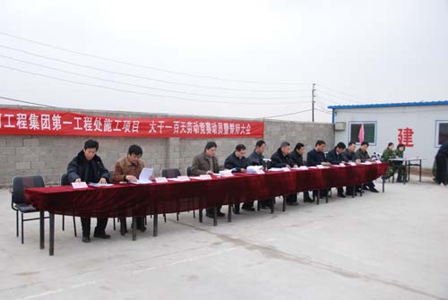 动员大会由第一工程处工会主席孙加明主持。在会议上,各项目部交纳了风险抵押金,签定了“目标责任状”。第一工程处党总支书记修林发传达了集团公司“规范管理年”精神,介绍了第一工程处各在建项目部的基本情况;第一工程处主任赵吉生做了“大干100天”动员讲话,强调了此次活动的重要性,鼓励全体员工奋发图强,抢赶进度,确保质量安全,一定要实现百日大干的目标。最后,集团公司史庆德副书记在总结发言中强调指出,为确保“大干100天”各项目标的顺利实现,要着重抓好以下几点:一是在抢赶施工进度的同时,要高度重视安全生产工作,以对党、对人民、对职工高度负责的精神把安全生产工作抓紧抓好。二是要把抓好施工质量作为活动的主要内容,强化质量意识,采取有效措施,确保施工质量,打造精品工程。三是要加强技术创新,及时召开各种专家论证会,向业主、监理、设计单位学习,少走弯路,不断提高施工技术水平,促进工程又快又好开展。