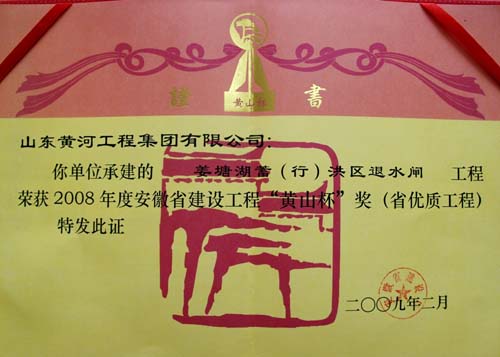 近日,从安徽省建设厅传来喜讯,山东黄河工程集团有限公司承建的淮委姜唐湖蓄(行)洪区退水闸工程荣获安徽省建设工程质量最高奖——“黄山杯”。这是山东黄河工程集团有限公司自行施工自行申报的又一项省部级优质工程奖项。