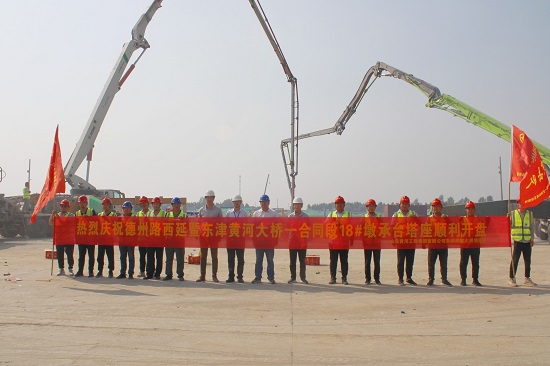 东津黄河大桥18#墩主塔承台采用矩形分离式承台,承台顶部设置楔形体塔座。主塔承台高4米,承台平面为两个23.2×23.2米的矩形;塔座高2米,均采用C40混凝土分层进行浇筑,主塔右幅总浇筑方量达3000立方米,为集团成立以来单次浇筑方量最大的桥梁大体积混凝土施工。