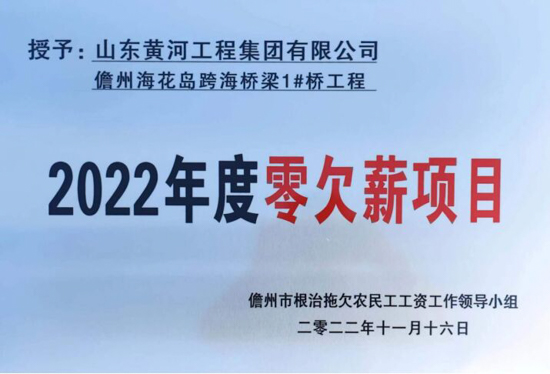 近日,由山东黄河工程集团承建的海南海花岛跨海桥梁工程1#桥被儋州市根治拖欠农民工工资工作领导小组授予“2022年度零欠薪项目”称号。