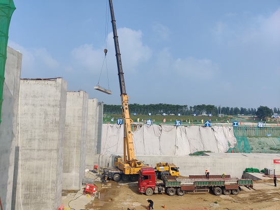 6月20日,位山闸项目一期主体工程交通桥首块预制板顺利安装完成。