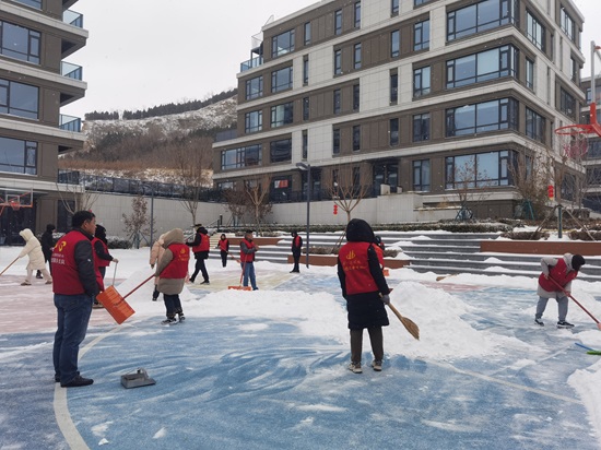 活动中,大家积极投身到扫雪队伍中,挥舞着铁锹和扫帚对所在园区道路、篮球场等地的积雪进行清扫,大家齐心协力、配合默契,园区的积雪得到了有效清理。