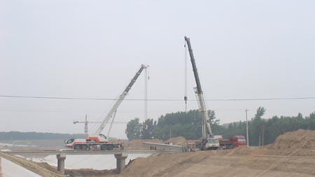 此次吊装工作采用2台75吨汽车吊,自6月3日开始吊装起,项目经理现场指挥,叮嘱技术人员吊装工作注意的细节、安全和质量控制要点,对预制板起吊、装车、运输、安放每一个环节严格要求,按照规范认真施工,确保工程安全、工程质量。随着最后一块边板安全就位,交通桥预制板的吊装工作顺利完成,符合交通桥设计及规范要求,无安全质量事故发生。