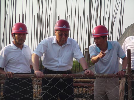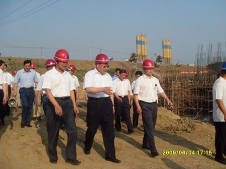 6月4日下午,国务院南水北调办公室张基尧主任和张野副主任在山东省水利厅杜昌文厅长、山东省南水北调建管局孙义福局长、王安德副局长、省环保局冯玉涛总工及济宁市领导陪同下到二级坝泵站工地现场视察工作,集团公司郭学鑫董事长到现场陪同。