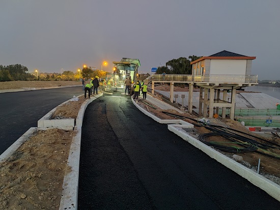 此次恢复的道路按照一级公路标准设计施工,总长度100米,宽35米,包含双向四车道及两侧辅道。为确保道路按时通车,项目部精心谋划,合理安排工期,紧密结合配套,有序施工,现已完成水泥稳定碎石及路沿石等施工内容,正在进行沥青路面施工。