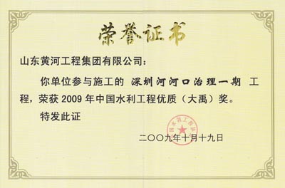 近日,从山东黄河工程集团有限公司传来喜讯,经过中国水利工程大禹奖申报、评审、网上公示等程序,中国水利工程协会评选出了2009年中国水利工程大禹奖 ,集团公司承建的深圳河河口治理一期工程名列其中,这也是山东黄河工程集团获得的第三块大禹奖奖牌。