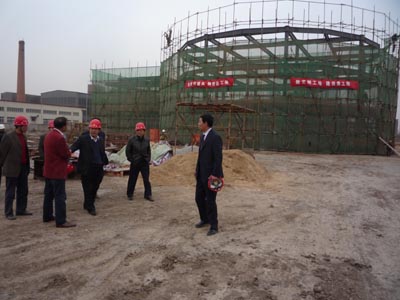 在金河公司总经理高景强的陪同下,郭学鑫董事长一行详细考察了施工现场,认真听取了项目经理铉炜对项目进展、施工进度、质量安全、项目部组织建设的汇报。郭董事长对工程的施工进度表示认可,对施工安全、质量监督及现场布置等表示满意,同时对施工中存在的不足提出了修改意见。