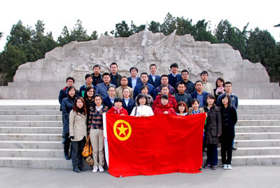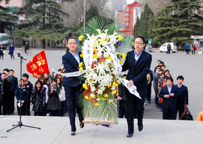 在英雄山烈士陵园的纪念碑前,团员青年们自觉地排起祭拜队伍;在肃穆庄严的国际歌声中,向革命烈士纪念碑敬献花圈,并静静地默哀,以表示心中的敬佩怀念之情。