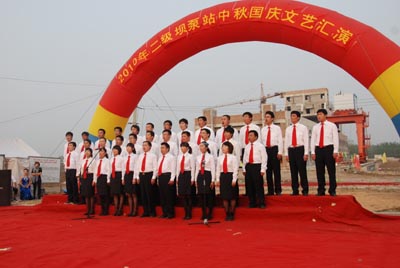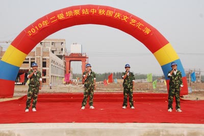 9月29日下午,由南水北调建设管理局主办,山东黄河工程集团有限公司、杭州亚太监理协办的“2010年二级坝泵站中秋国庆文艺汇演”在二级坝泵站施工现场举行。山东省南水北调建设局副局长罗辉、淮委建设局局长陈光临、山东黄河工程集团董事长郭学鑫现场观看了演出。