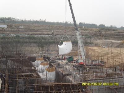 10月7日,南水北调东线一期工程邓楼泵站枢纽工程主厂房进水流道定型模板吊装顺利完成。