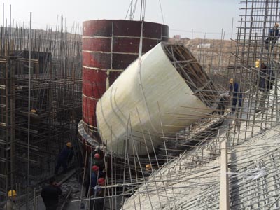 邓楼泵站工程设计输水流量100m3/s,采用虹吸式出水流道,模板制作工艺复杂,安装精度要求高。流道模板为定型木模骨架,筒身部分外镶一层竹胶板,流道部分外镶一层木条,高6.35m,直径4.20m,总重5.0T。吊装过程中采用一台25T吊车装车,一台75T吊车安装定位,全站仪精确定位控制,历时8小时顺利完成安装,本次吊装为春节前完成出水流道混凝土浇筑奠定了良好基础,确保了施工总进度计划的按期完成。