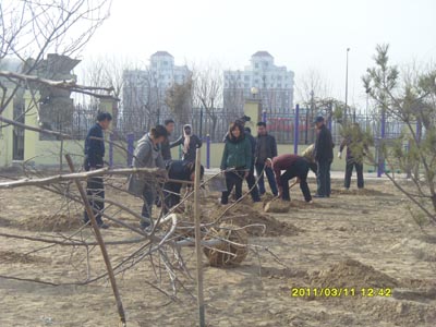 捋起衣袖,挥起镐头,抡起铁锹,放眼望去,现场一片热火朝天的景象,大家齐心协力,将一棵棵树苗栽入土中,扶苗,填土,浇水,短短的两个小时,满园的树苗迎风站立,在春风中展示勃勃生机。