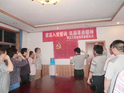 为迎接党的90岁生日,教育引导广大党员在施工一线始终保持先进性, 5月18日第三工程处组织全体党员开展了“重温入党誓词,弘扬革命精神”主题党员活动。