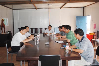 在项目部会议室董书记听取了项目部负责人的工作汇报。董书记在了解项目部基本情况后,对前期工作予以充分肯定并提出四点要求:一是抓好二次经营工作;二是抓好安全工作;三是做好多元化发展,努力使转型成功;四是做好后勤工作,保证施工顺利开展。会议结束后,在项目部负责人的陪同下参观了项目部生活环境。