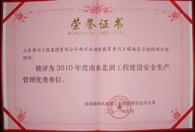 6月16日,国务院南水北调工程建设委员会在南京召开南水北调工程建设安全生产工作会议。山东黄河工程集团有限公司东线穿黄河工程南区II标段项目经理部,被评为2010年度南水北调工程建设安全生产管理优秀单位。