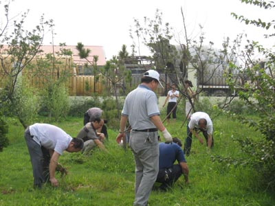 7月12日上午,第二工程处组织全体职工对庭院花圃进行了义务拔草。