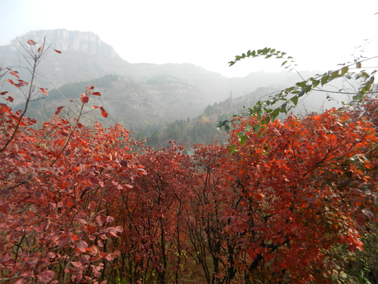 一大早就和几个好友搭上了去红叶谷的汽车,一种神秘感伴随着朝阳的升起油然而生。去往红叶谷方向的车明显多于其他路段,看来大家都是慕名前来观赏红叶的。出了城区,已经感觉不到城市的紧张和喧嚣了,汽车在峡谷中行驶,弯曲的山路让车速变得很慢,车窗外的峭壁带来了一种莫名的压抑感,山体上密布的红叶又给人无限的憧憬。忽然,眼前一亮,我们穿过了峡谷,“红叶谷”四个大字映入眼帘。